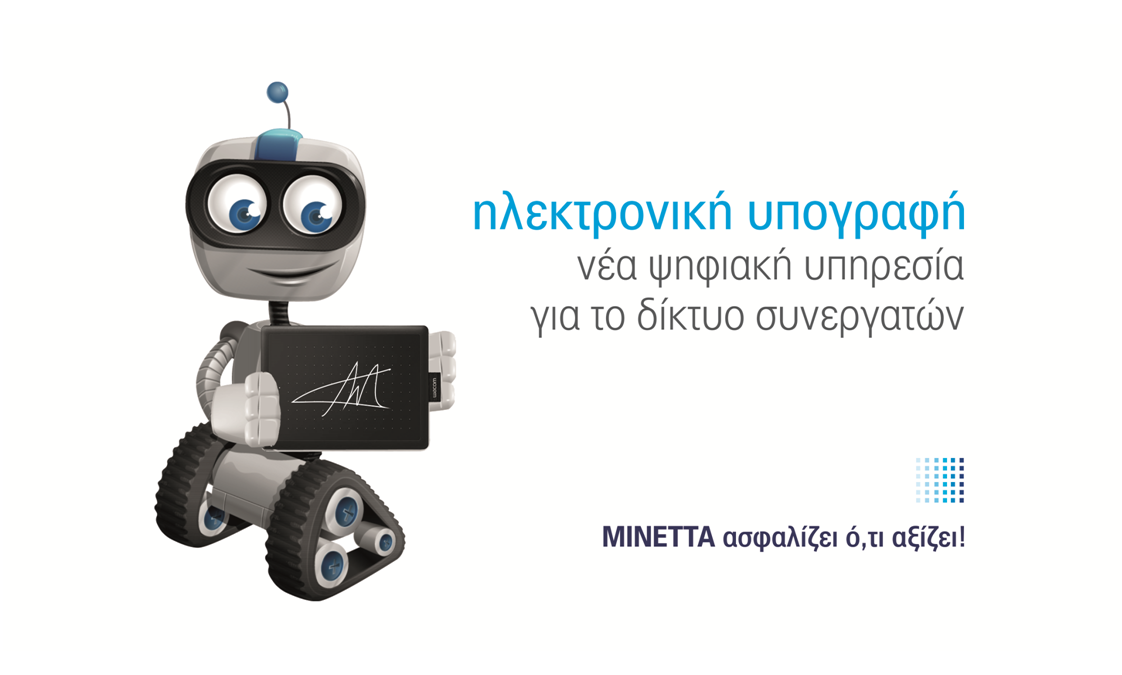 Η ΜΙΝΕΤΤΑ Ασφαλιστική, θέλοντας συνεχώς να διευκολύνει το έργο του δικτύου των συνεργατών της, διαθέτει μια νέα λειτουργία μέσω του online συστήματος της, παρέχοντας τη δυνατότητα ηλεκτρονικής υπογραφής.