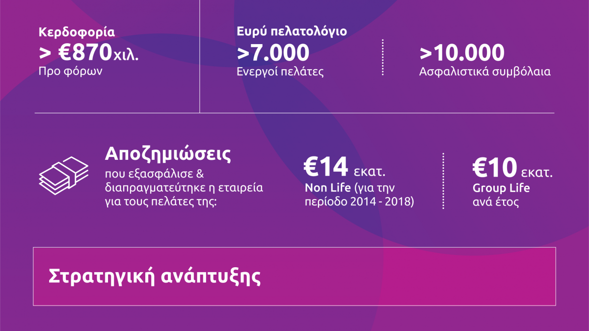 Τα μικτά υπό διαχείριση ασφάλιστρα για το 2018 ανήλθαν στα €46 εκατ., σημειώνοντας αύξηση 7,1% σε σύγκριση με το 2017, παρουσιάζοντας σταθερά ανοδική πορεία από το 2014 και καταγράφοντας το υψηλότερο της τελευταίας πενταετίας. Ανοδικά κινήθηκε και σε επίπεδο αποζημιώσεων, καθώς κατά τη διάρκεια της προηγούμενης χρονιάς διαπραγματεύτηκε και εξασφάλισε για τους πελάτες της συνολικές αποζημιώσεις που ξεπέρασαν τα €10 εκατ. στις ασφαλίσεις Ζωής, Υγείας και Γενικές Ασφαλίσεις.