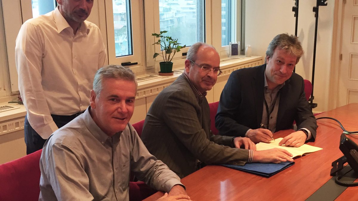 Φωτογραφία: Στιγμιότυπο από την υπογραφή αύξησης της εισφοράς της INTERAMERICAN στο ΤΕΑ για τους εργαζομένους της μέλη του Ταμείου. Ο Διευθύνων Σύμβουλος Γιάννης Καντώρος και εκ μέρους του Ταμείου ο Πρόεδρος, Βαγγέλης Θωμόπουλος και των εταιρειών του ομίλου που το χρηματοδοτούν ο Διευθυντής Αναλογιστικού, Γιάννης Τοτός.