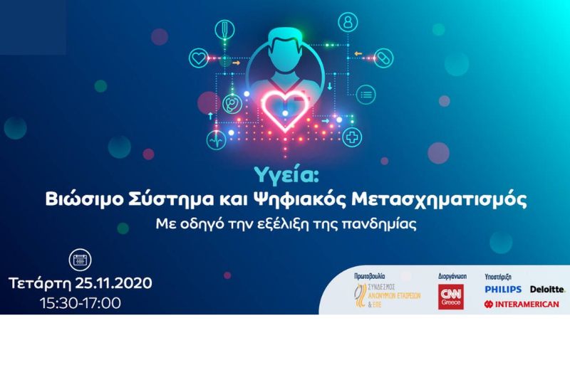 Τη σημαντικού περιεχομένου Διαδικτυακή Συζήτηση για την Υγεία, που οργανώνεται με τη σύμπραξη του Συνδέσμου ΑΕ&ΕΠΕ, της INTERAMERICAN, της Philips και με την υποστήριξη της Deloitte, μπορείτε να την παρακολουθήσετε σε live streaming από την πλατφόρμα του διαύλου ειδήσεων cnn.gr.