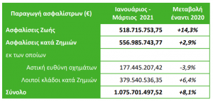 Σύμφωνα με τα στοιχεία αυτά (κατόπιν προσαρμογής των δεδομένων του προηγούμενου χρονικού διαστήματος με νεότερες απαντήσεις), από τη σύγκριση των δηλώσεων παραγωγής ασφαλίστρων των μηνών Ιανουαρίου – Μαρτίου του 2021 των ανωτέρω επιχειρήσεων με τις αντίστοιχες της ίδιας περιόδου για το 2020 των ιδίων επιχειρήσεων, προκύπτουν τα παρακάτω: