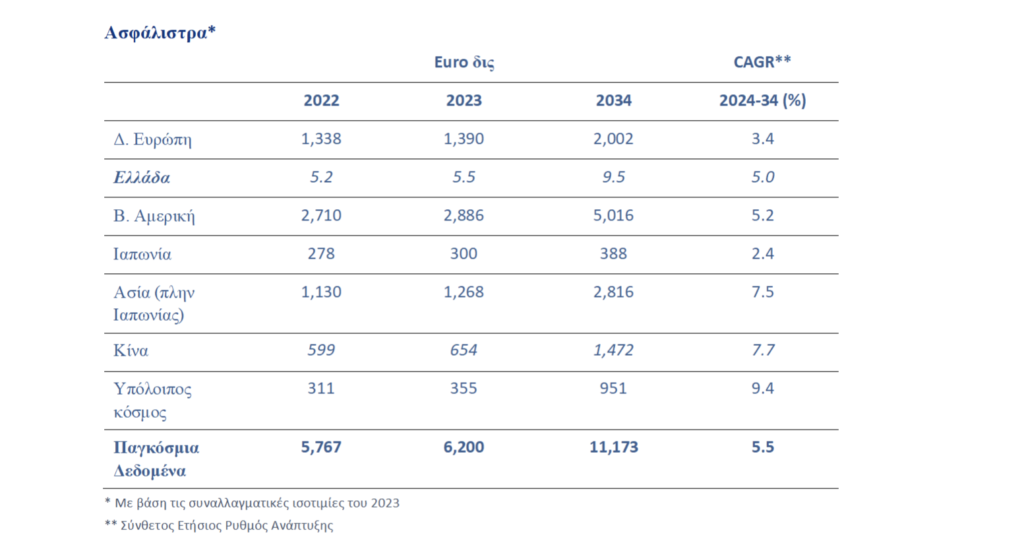 Κατά την επόμενη δεκαετία, η παγκόσμια ασφαλιστική αγορά αναμένεται να σημειώσει αύξηση με ετήσιο ρυθμό 5,5%, δηλαδή με ακριβώς τον ίδιο ρυθμό με το παγκόσμιο ΑΕΠ. Τις προηγούμενες δεκαετίες, η ανάπτυξη της ασφαλιστικής αγοράς υστερούσε σε σχέση με την οικονομική ανάπτυξη. Η βαρύτητα των τριών επιμέρους κλάδων αναμένεται να μεταβληθεί: Ο κλάδος περιουσίας και ατυχημάτων θα αναπτυχθεί κατά 4,7% ετησίως, σε συνέχεια της αύξησης του 5,0% ετησίως που σημείωσε την προηγούμενη δεκαετία, καθώς οι αυξήσεις τιμών που σχετίζονται με τον πληθωρισμό θα ελαττωθούν. Ο κλάδος υγείας αναμένεται να αναπτυχθεί επίσης, αλλά με κάπως πιο χαμηλό ρυθμό της τάξεως του 7,3% ετησίως – που εξακολουθεί, παρόλα αυτά να αποτελεί μια αρκετά υψηλή αύξηση. Αντίθετα, ο κλάδος ζωής ενδέχεται να αναπτυχθεί κατά 5,1% ετησίως (από 3,5% ετησίως), επωφελούμενος από τα υψηλότερα επιτόκια. Συνολικά, το παγκόσμιο απόθεμα ασφαλίστρων αναμένεται να αυξηθεί κατά σχεδόν 5 τρισεκατομμύρια ευρώ.