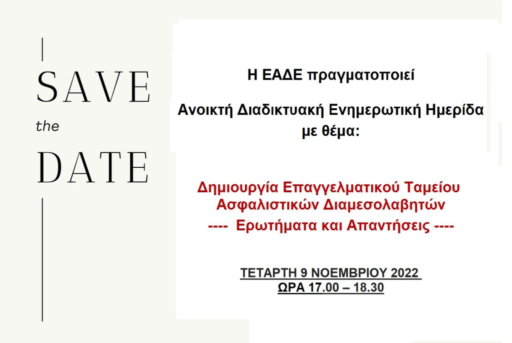 Η ΕΑΔΕ πραγματοποιεί ανοιχτή διαδικτυακή ενημερωτική ημερίδα με θέμα “”Δημιουργία Επαγγελματικού Ταμείου Ασφαλιστικών Διαμεσολαβητών”, την Τετάρτη 9 Νοεμβρίου.