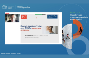 Ο κ. Ηλίας Μόσιαλος, Καθηγητής Πολιτικής και Διοίκησης της Υγείας Ιατρικής Σχολής του Imperial College of London, σχολίασε το γεγονός ότι οι αυξανόμενες δαπάνες υγείας και η χρηματοδότησή τους είναι ένα διεθνές πρόβλημα και αναφέρθηκε στο πολύ υψηλό ποσοστό χρηματοδότησης δαπανών υγείας από τους Έλληνες πολίτες. Στη συνέχεια ανέλυσε το ρόλο της Ιδιωτικής ασφάλισης υγείας στις Ευρωπαϊκές χώρες. Κλείνοντας την ομιλία του, ανέφερε ότι: «Η πιθανότητα συμπράξεων με τον Δημόσιο Τομέα, που αυτή τη στιγμή δεν υπάρχει στη χώρα μας, θα είναι εφικτή μόνον εάν υπάρξει ένα αναβαθμισμένο προϊόν του Δημόσιου τομέα». Και συνέχισε: «θα πρέπει να αντιμετωπίζουμε το σύστημα υγείας της χώρας συνολικά από εδώ και εμπρός. Πρέπει να μιλάμε για ενιαίο σύστημα υγείας και αυτό σημαίνει δημόσιος τομέας, ιδιωτικός τομέας και το σύστημα των Ενόπλων Δυνάμεων».