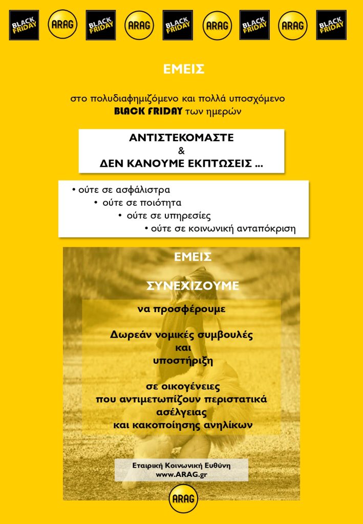 Η ARAG, με αφορμή την Black Friday, χρησιμοποιεί τις “εκτπώσεις” των ημερών για αντίσταση. Με μία επιστολή, δηλώνει ότι δεν κάνει εκπτώσεις όσον αφορά τα περιστατικά ασέλγειας και κακοποίησης ανηλίκων. Προσφέρει δωρεάν νομικές συμβουλές και υποστήριξης στις οικογένειας που αντιμετωπίζουν τέτοια περιστατικά.