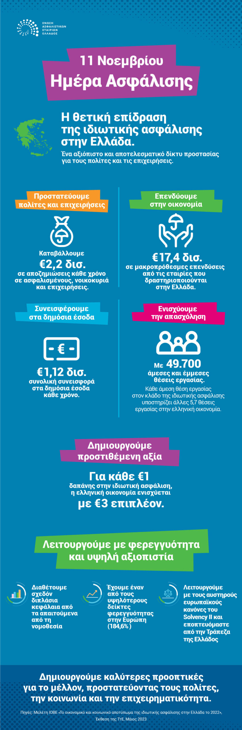 Σύμφωνα με τα συμπεράσματα της μελέτης για το Οικονομικό & Κοινωνικό Αποτύπωμα της Ιδιωτικής Ασφάλισης στην Ελλάδα το 2022, ο κλάδος προσφέρει ουσιαστική υποστήριξη στην ελληνική οικονομία και κοινωνία, παρέχει προστασία σε άτομα, επιχειρήσεις και οργανισμούς και συμβάλλει καταλυτικά στην επιχειρηματικότητα, την οικονομική ανάπτυξη και την κοινωνική σταθερότητα.