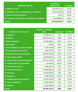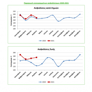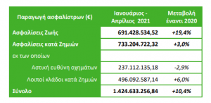 Σύμφωνα με τα στοιχεία αυτά (κατόπιν προσαρμογής των δεδομένων του προηγούμενου χρονικού διαστήματος με νεότερες απαντήσεις), από τη σύγκριση των δηλώσεων παραγωγής ασφαλίστρων των μηνών Ιανουαρίου – Απριλίου του 2021 των ανωτέρω επιχειρήσεων με τις αντίστοιχες της ίδιας περιόδου για το 2020 των ιδίων επιχειρήσεων, προκύπτουν τα παρακάτω: