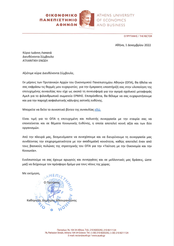 Ακολουθεί ευχαριστήρια επιστολή του Πρύτανη του Οικονομικού Πανεπιστημίου Αθηνών, Καθ. Δ. Μπουραντώνη: