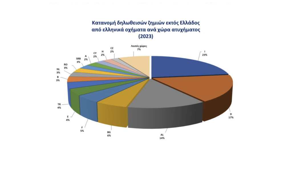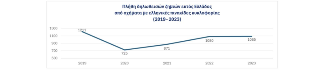 Όσον αφορά στα ατυχήματα που προκαλούνται από οχήματα με Ελληνικές πινακίδες στο εξωτερικό, παρατηρείται επίσης σταδιακή άνοδος. Έτσι για το 2023 ο αριθμός των ατυχημάτων στο εξωτερικό ανήλθε σε 1085 έναντι 1080 το 2022, παρουσιάζοντας αύξηση 0,5%.