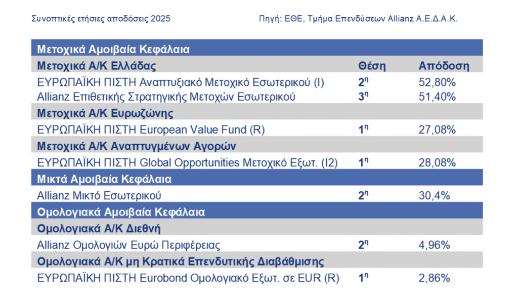 · Στην κατηγορία των Μικτών Αμοιβαίων Κεφαλαίων, το Allianz Μικτό Εσωτερικού κατέλαβε τη δεύτερη θέση για το 2025, πετυχαίνοντας ετήσια απόδοση 30,40%, ενώ παραμένει πρώτο για την τριετία 2023–2025, με συνολική απόδοση 86,95%.