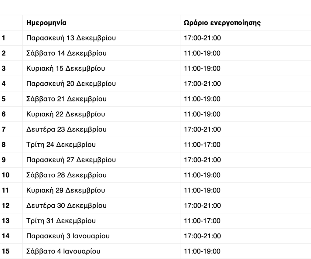 Προκειμένου όσο το δυνατόν περισσότεροι επισκέπτες να έχουν την ευκαιρία να γίνουν «Καλαντιστές» και να διεκδικήσουν τα υπέροχα δώρα, η χριστουγεννιάτικη ενέργεια της Eurolife FFH στα EurolifeHub θα διαρκέσει για 15 ολόκληρες μέρες, με το πρόγραμμα να διαμορφώνεται ως εξής: