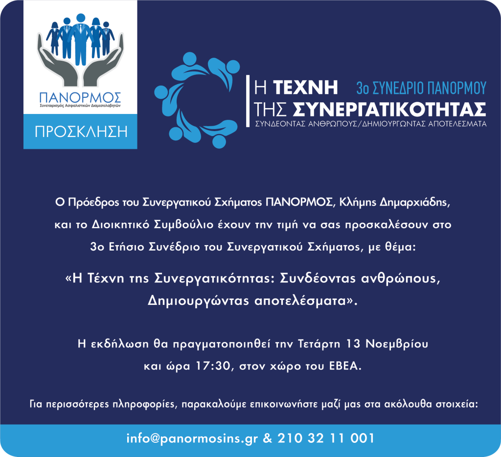 “Το Συνεργατικό Σχήμα ΠΑΝΟΡΜΟΣ διοργανώνει το 3 ο του Συνέδριο με τίτλο : “Η Τέχνη της Συνεργατικότητας: Συνδέοντας Ανθρώπους, Δημιουργώντας Αποτελέσματα”.