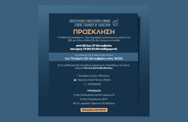 Το Επαγγελματικό Επιμελητήριο Αθηνών και η Δημιουργική Ομάδα Καλλιτεχνών του Ε.Ε.Α. πραγματοποιούν, 28-31/10, την πρώτη τους έκθεση ζωγραφικής & φωτογραφίας, στο «ΣΕΡΑΦΕΙΟ» Κέντρο Πολιτισμού του Δήμου […]