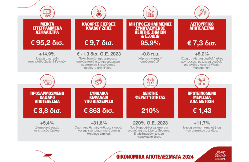 Ιστορικό ρεκόρ λειτουργικού και προσαρμοσμένου καθαρού αποτελέσματος. Σημαντική αύξηση μεικτών εγγεγραμμένων ασφαλίστρων στα €92,5 δισ. (+14,9%) με ισχυρή ανάπτυξη στον κλάδο Ζωής (+19,2%) και τον κλάδο