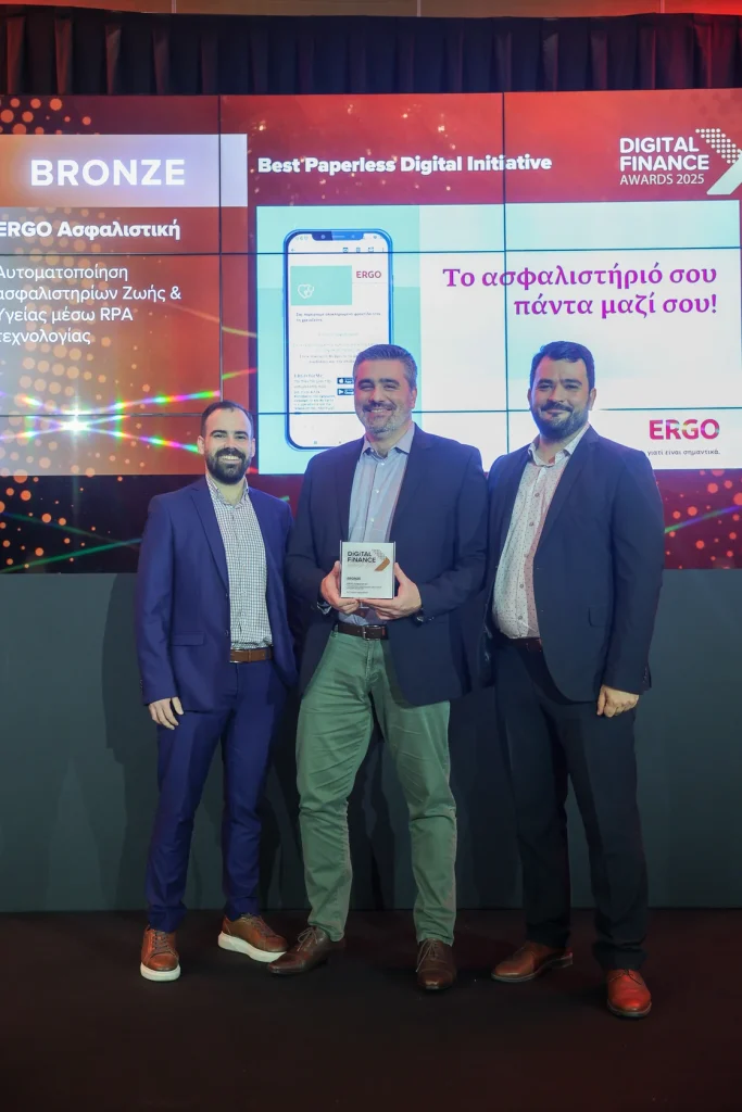 Άλλη μια διάκριση απέσπασε και η αξιοποίηση της τεχνολογίας RPA (Robotic Process Automation) στον κλάδο Ζωής και Υγείας, με την εταιρεία να λαμβάνει το χάλκινο βραβείο στην κατηγορία Best Paperless Digital Initiative. Μέσω της πλήρους αυτοματοποίησης της διαδικασίας παραγωγής, ηλεκτρονικής αποστολής και αρχειοθέτησης των ασφαλιστηρίων συμβολαίων, η ERGO ασφαλιστική ενισχύει τις paperless-ψηφιακές πρακτικές της. Κατά αυτόν τον τρόπο επιτυγχάνεται η μετάβαση από τη χρονοβόρα διαδικασία έκδοσης-αποστολής εντύπου ασφαλιστηρίου σε άμεση έκδοση-αποστολή ψηφιακού ασφαλιστηρίου, ενώ ταυτόχρονα διασφαλίζεται: η βελτιωμένη εμπειρία πελάτη με την άμεση παραλαβή του ασφαλιστηρίου στο e-mail, η λειτουργική αποδοτικότητα με την αποδέσμευση χρόνου από επαναλαμβανόμενες εργασίες, η μείωση κόστους και η εκμηδένιση σφαλμάτων.