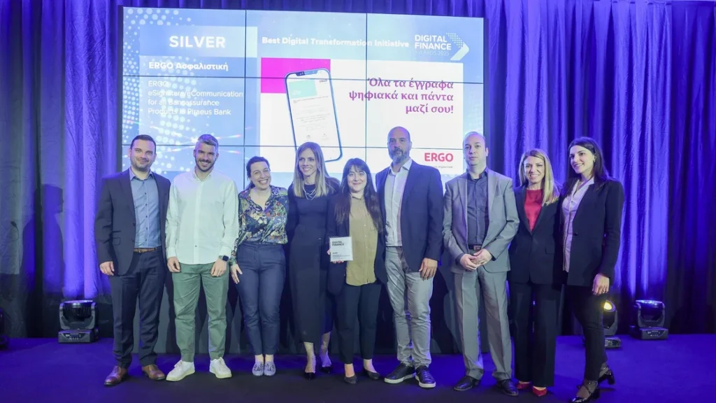 Στην κατηγορία Best Digital Transformation Initiative, η εταιρεία απέσπασε αργυρό βραβείο για την εφαρμογή ERGO eSignature/Communication η οποία κάνει την ασφάλιση άμεση, απλή και εύκολα προσβάσιμη. Παράλληλα, ενισχύει τη δέσμευση της εταιρείας στη βιωσιμότητα και την περιβαλλοντική υπευθυνότητα.